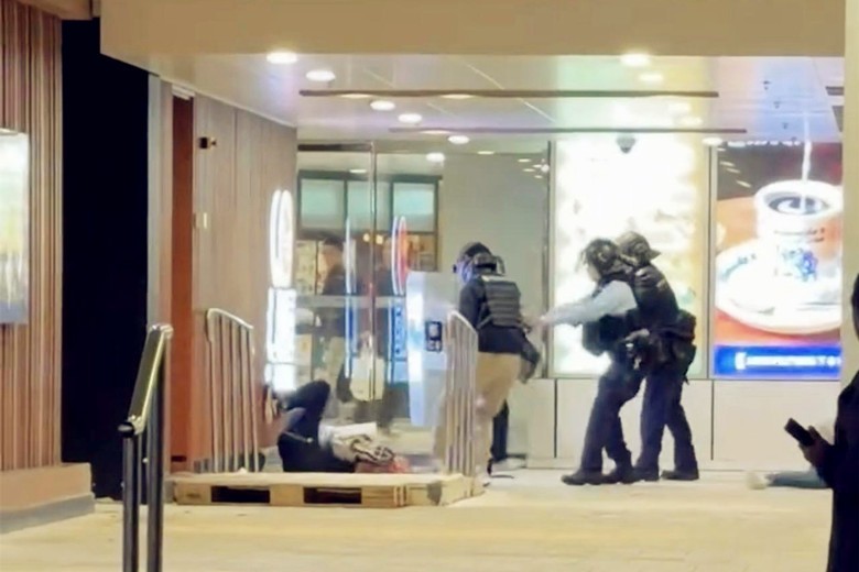 2026年1月15日晚,香港屯門市廣場狂漢揮舞利刀引發途人恐慌並挾持女子以圖施襲,兩警員各開一槍擊斃持刀狂漢救出女子。圖為事發時現場監控畫面。